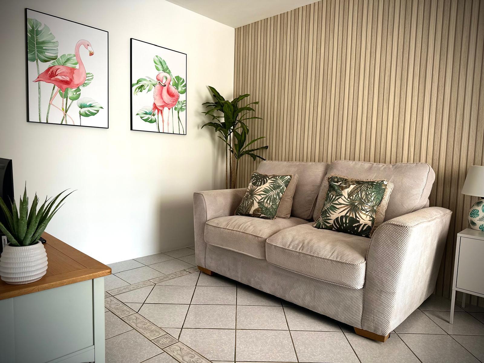 Living room with sofa, tropical cushions, and flamingo wall art at Villa Sunrise, Flamingo Bay Villas Aruba.