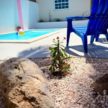 Poolside loungers with yellow cushions at Villa Sunrise, Flamingo Bay Villas in Aruba.